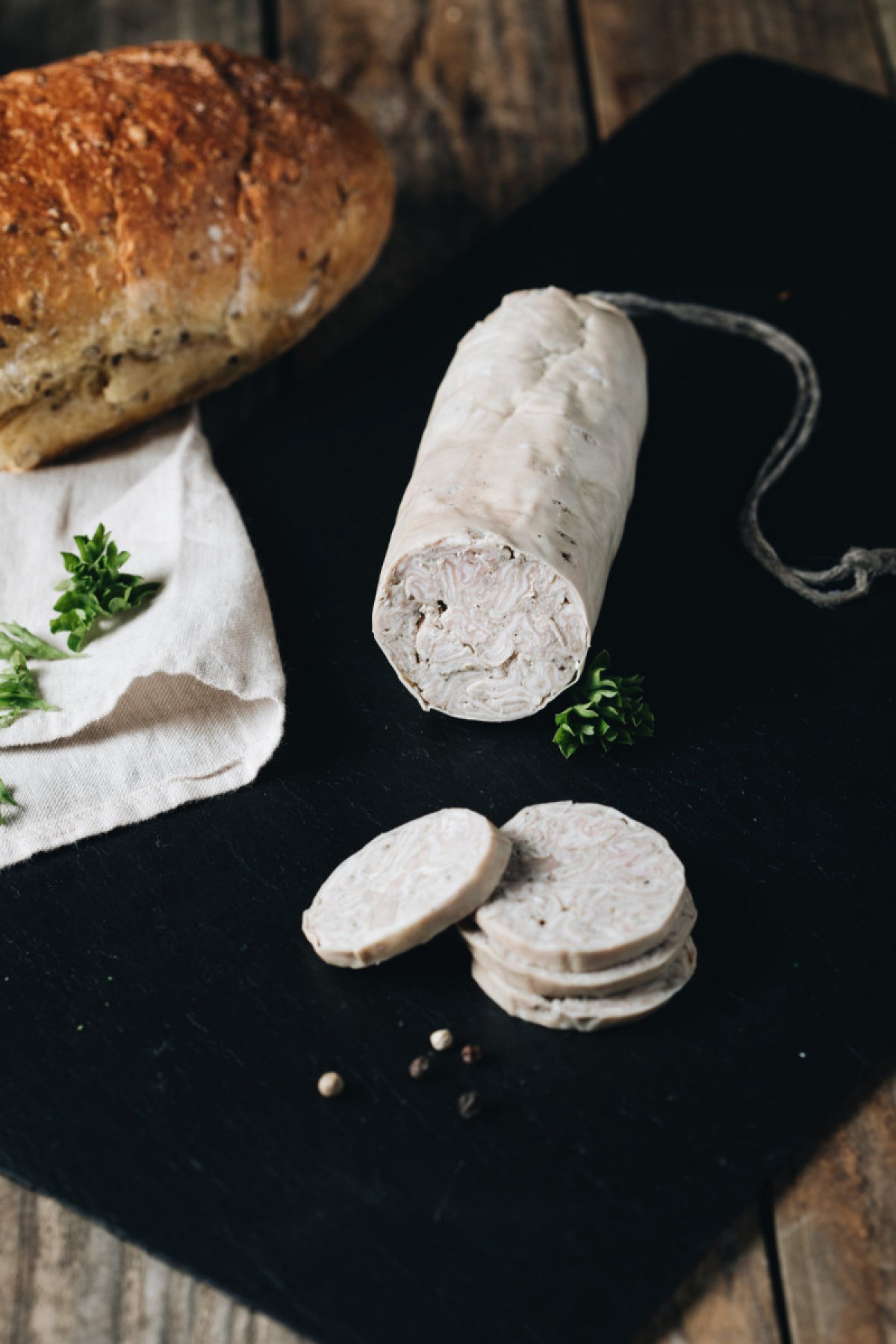 Ces andouillettes, montées sur une ficelle de Lin, ont pour originalité d’être entièrement faites à la main avec amour. Les chaudins de porc utilisés vont ensuite, grâce à une recette de grand-mère, mariner dans une alliance de muscadet, moutarde et épices.